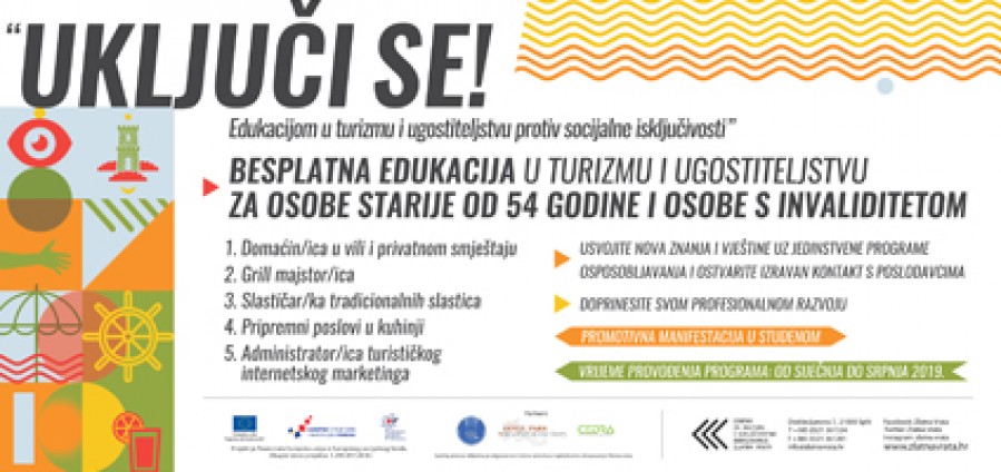 Pozivamo vas da nam se pridružite 26. studenog 2018. god. u 11 sati u prostorijama Pučkog otvorenog učilišta, ul. Ante Starčevića 7 u Imotskom na kratkoj prezentaciji programa besplatnih edukacija za osobe s invaliditetom i za nezaposlene osobe, starije od 54 godine koje započinju u siječnju 2019. god. u sklopu projekta Uključi se! Edukacijom u turizmu i ugositeljstvu protiv socijalne isključivosti (oznaka projekta UP 02.2.2.03.0023.).