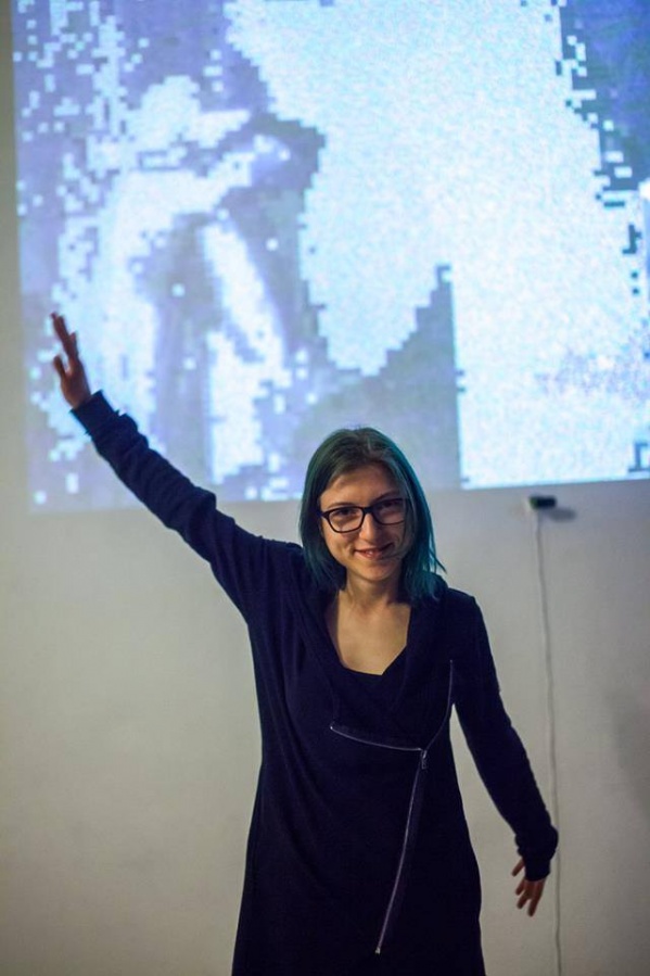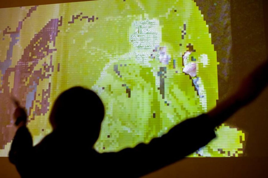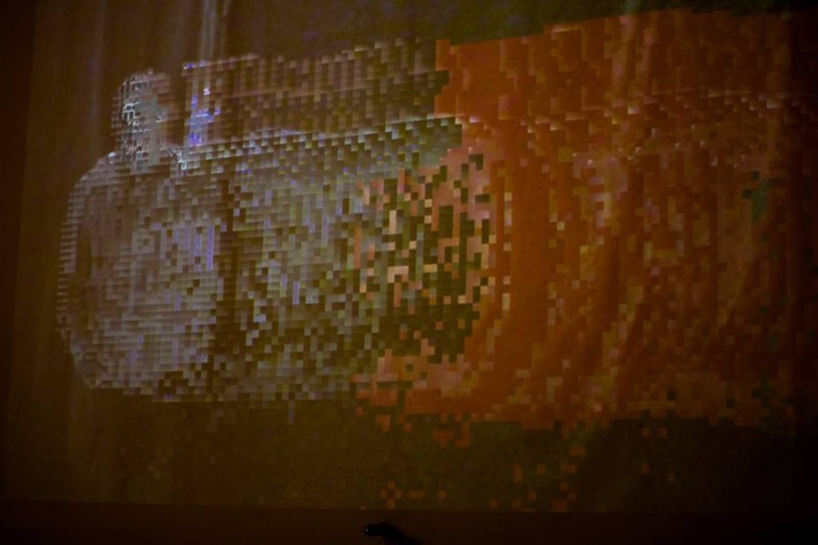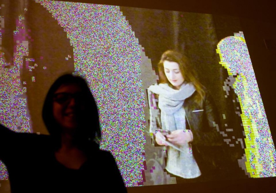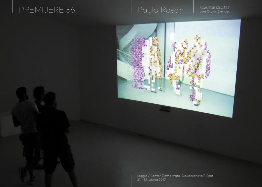 Digitalno. Svijet se danas kreće samo u tom smjeru. Svaki aspekt ljudskog života se poku- šava svesti na digitalnu razinu, ali obzirom da smo glavni protagonisti takvog svijeta treba ukazati i na bitnu činjenicu – mogućnost pogreške. U samoj srži digitalnog računala kašnjenje u interakciji određenih komponenti dovodi do poznatih, ali i nepoznatih opasnosti koje mogu rezultirati glitchem. Glitch kao takav je kratkotrajna pogreška na digitalnom zapisu koja se dogodi pri prijenosu i obradi podataka (proces kojeg je Lev Manovich nazvao transkodiranjem, kao posljednjim od pet osnovnih principa u novomedijskoj umjetnosti), ali ju je jako teško otkriti iz razloga što se automatski sama ispravlja. Nadalje, glitch umjetnost se pojavila krajem sedamdesetih godina XX. stoljeća kao praksa označavanja pogrešaka u sustavima audio i video zapisa i fotografija. Glitch umjetnici se zabavljaju slučajnom greškom, svjesno je izazivajući poigravajući se vizualnim i digitalnim kodom u svrhu mijenjanja estetike, a upravo je to razlog zbog čega se navedena umjetnost naziva i umjetnošću namjerne greške. Njena priroda je interdisciplinarna pa zahtijeva povezivanje različitih grana produkcije, od umjetnika, preko programera i dizajnera koji kroz svoj rad pridonose boljem shvaćanju digitalne kulture. Na taj način umjetnost postaje sredstvom manipulacije digitalnim medijima, sredstvom izobličavanja ustaljenih načina njihova funkcioniranja i ukazivanja na nesavršenu prirodu digitalnog podatka koji se u suštini smatra trajnim. Potaknuta vlastitim iskustvom, odnosno susretima s uništenim digitalnim zapisima videa i fotografija kroz svoj dosadašnji rad, autorica Paula Rosan, studentica na Odsjeku za film i video pri Umjetničkoj akademiji u Splitu, radom “.jpg” istražuje promjenjivost i nepredvidivost glitcha. U svojoj nestalnosti i pogrešnosti, glitch je vizualno zanimljiv, ali autorica ipak kontrolira što se s njim događa. Ispitujući njegovu prirodu, shvatila je da ga može izmanipulirati i „ukrotiti“ programiranjem aplikacije koja će njime upravljati. Rad je napravljen kao web aplikacija kojoj se pristupa kroz browser. Programska aplikacija u izložbenom prostoru funkcionira na način da s web kamere uživo preuzima snimku, frame po frame i prikazuje je na ekranu, a u pozadini se spremaju dvije slike – trenutni i prethodni frame. Spomenuti frameovi su podijeljeni na regije određene visine i širine, a od svake regije se uzima prosjek RGB vrijednosti srednjeg piksela koji se uspoređuje s onim prošlog piksela. Aplikacija prepoznaje da se dogodila promjena unutar regije ako je vrijednost veća od zadane, te ukoliko do nje dođe iscrtava se glitch-efekt. Glitch predstavlja funkcija koja na ulazu prima tu regiju, obrađuje je pomoću algoritama i takvu vraća na ekran. Funkcije se mijenjaju i stvaraju kombinacije svake sekunde, a aplikacija nasumično odabire između generiranja šuma, kolorizacije u RGB spektru ili kombinacije boja, sortiranja piksela prema svjetlini i prema RGB ili kombinaciji vrijednosti. Moguće je da se sve funkcije odjednom upale, ali i da se nijedna ne upali. Glitch-efekt se iscrtava na odvojen sloj, a vremenom mu se povećava transparentnost kako bi se postupno pojavila originalna slika bez efekta, koja se nalazi ispod glitcha. Zbog toga se svakim pokretom osobe kroz prostor stvara glitch na projekciji, a kao takav nije stalan niti trajan, već se pojavljuje i nestaje kako osoba mijenja svoje kretanje. Rad “.jpg” predstavlja novinu upravo zbog toga što je aplikacija, a ne „gotov“ proizvod – prisutan je u sadašnjosti, neovisan o prostoru, a opet ovisan o ljudima i predmetima od kojih traži pažnju i zahtijeva interakciju u kojoj se prema svakome ponaša nepredvidivo i drugačije. Naposljetku, računala su ipak strojevi i ovise o ljudskoj interakciji, a autorica je upravo taj odnos htjela prikazati u sferi u kojoj čovjek nema fizičkog kontakta s računalom, već ono nasumično odabire na koji način će prikazati objekt ispred sebe. Mia Kragujević