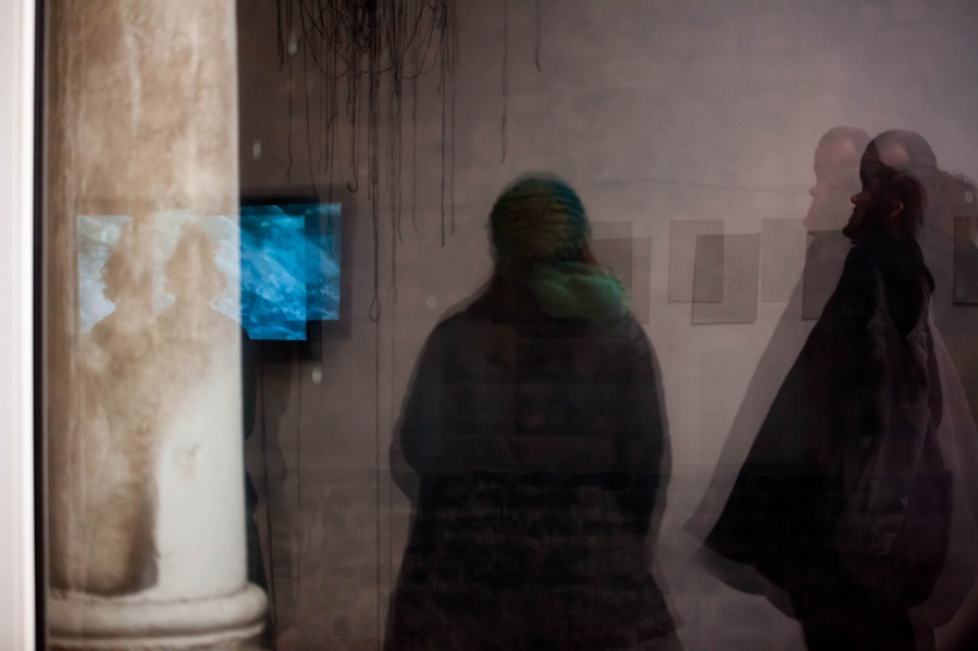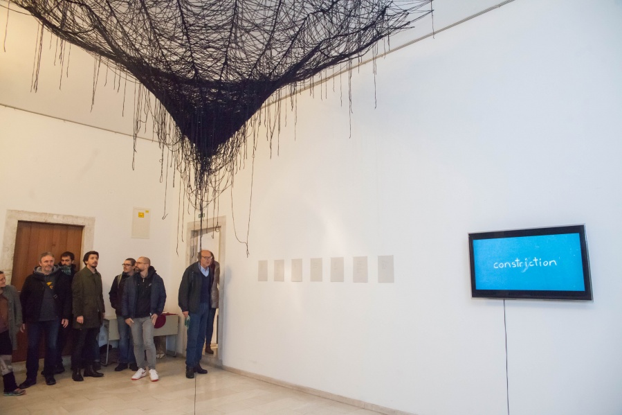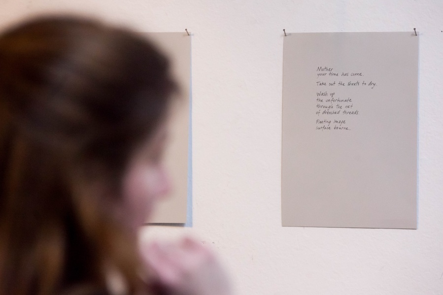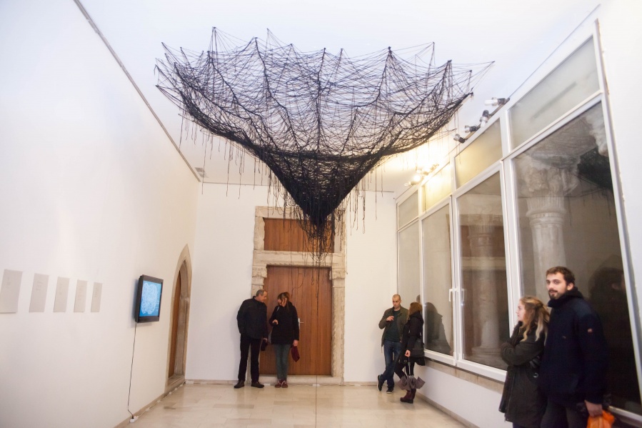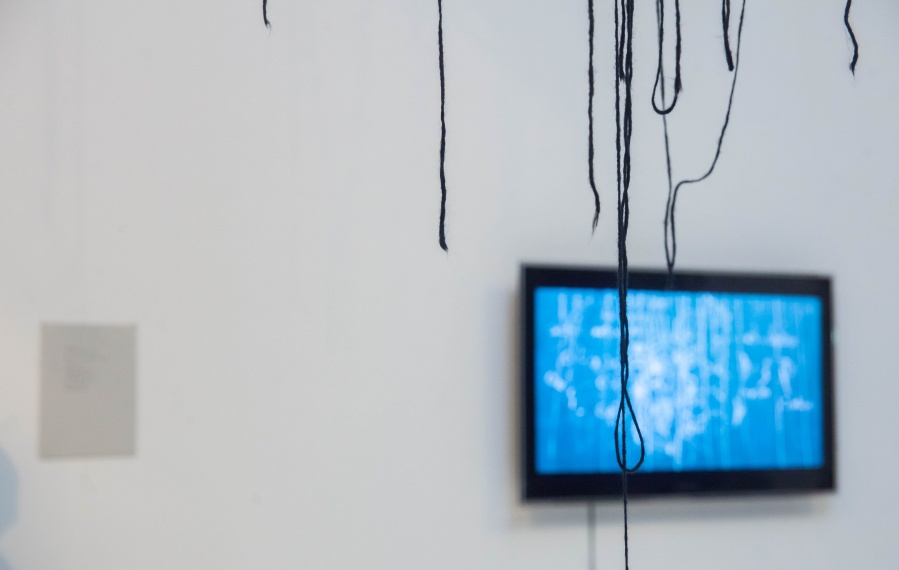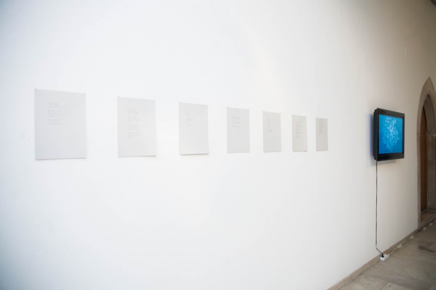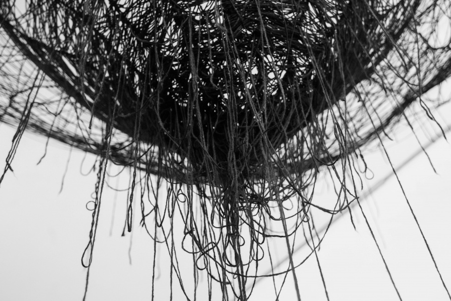 The interconnectedness of people and nature is what this exhibition is to remind us of. In creating this exhibition, Irene Reichart has decided to show just how much in common nature has with what we experience in our lives. Starting with seven poems, we are cast into an emotional vortex of the artist. They unravel an intimate path woven with emotions of disbelief and fear, patience, and finally finding strength. The video we reach next visualises this movement. It shows how our emotions can be correlated with natural processes. These processes show us how dissolution can be constructive, and that even a void can be a creation. Similarly, for us to grow we first have to crumble to pieces and let go of what we thought was truth and the striking woollen installation represents threads of processes composing and decomposing us as individuals.