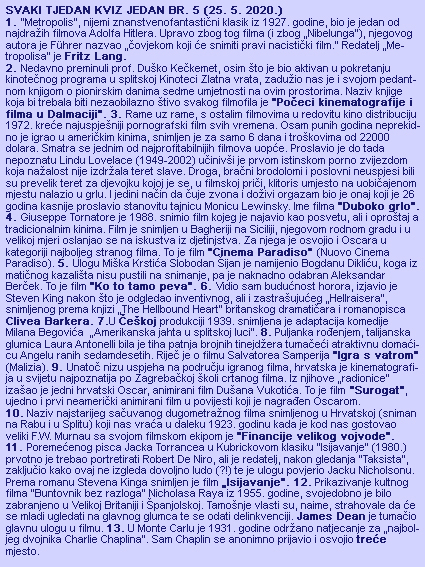 Danas je teško zamisliti jedan veći grad bez specijalnog kinematografa kinoteke, gdje se uz kratka uvodna predavanja prikazuju djela čuvenih redatelja, priređuju izložbe, ankete i razvija interesantna filmološka aktivnost. Kinoteka danas zadovoljava neke kulturne potrebe suvremenog čovjeka isto onako kao što koncertne poslovnice ili pinakoteke okupljaju ljubitelje drugih umjetnosti... (SD/Kultura/Vojko Mirković, rujan 1961.)